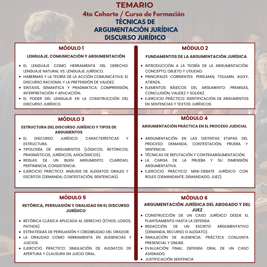 El programa propone un recorrido integral que combina fundamentos teóricos y ejercicios prácticos de análisis del lenguaje, interpretación normativa, construcción de discursos y estrategias argumentativas aplicadas a casos reales.